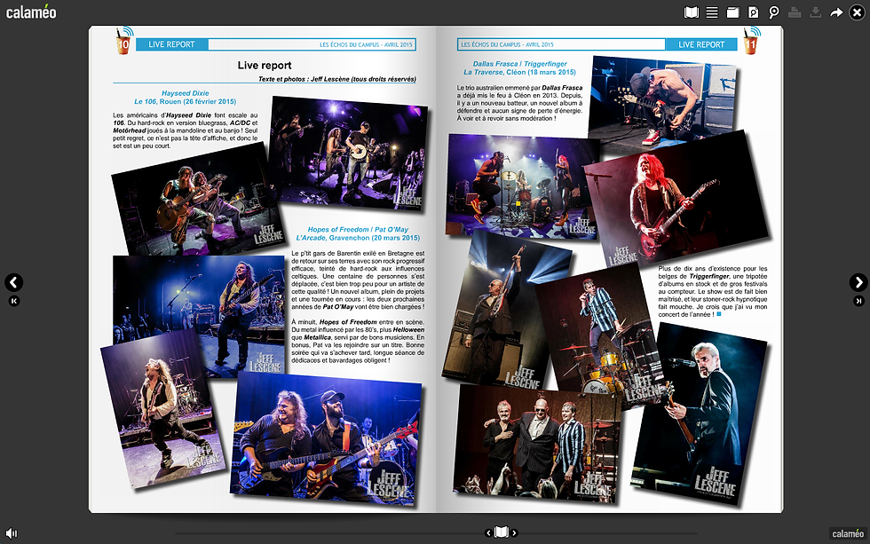 Les Echos du Campus avril 2015jeff7 avr. 20151 min de lecture Les Echos du Campus N°18 P10-11 Hayseed Dixie au 106 - Hopes of Freedom et Pat O' May à Gravenchon - Dallas Frasca et Triggerfinger à Cléon